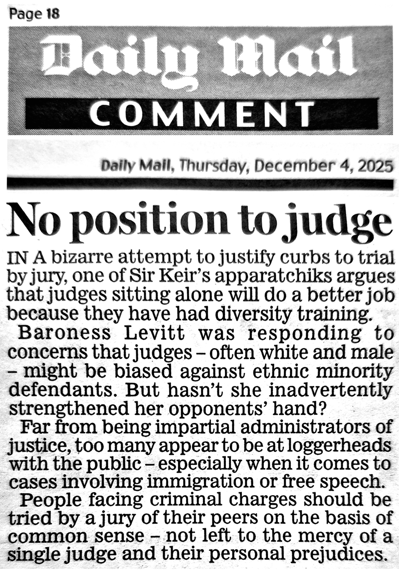 To reduce the enormous backlog of criminal cases waiting to be heard Justice Secretary David Lammy wants to limit trial by jury to those cases which are punishable by a prison sentence in excess of three years. This will leave the Magistrates Courts to deal with those (many) cases where the maximum sentence is under three years - which David Lammy thinks will be dealt with fairly quickly and therefore considerably reduce the backlog and waiting times for 'victims'. This is a disastrous proposal - due to become law by the end of 2026. Magistrates are, in essence, pro-establishment. Riddled with prejudice. Juries are much, much fairer. There will be many miscarriages of justice under the auspices of a Magistrate if this Lammy law is enacted. The Daily Mail got it right! Read on.