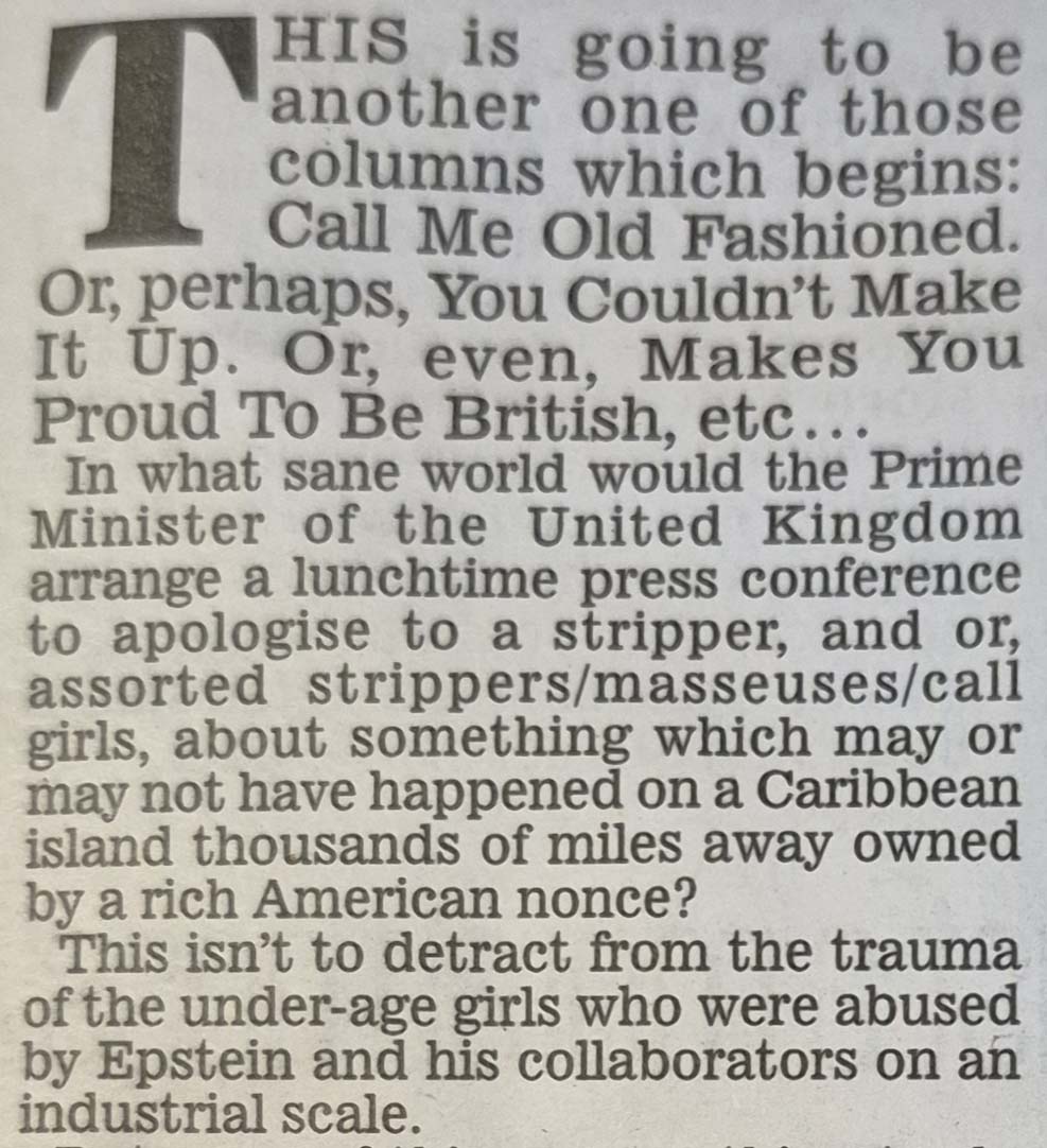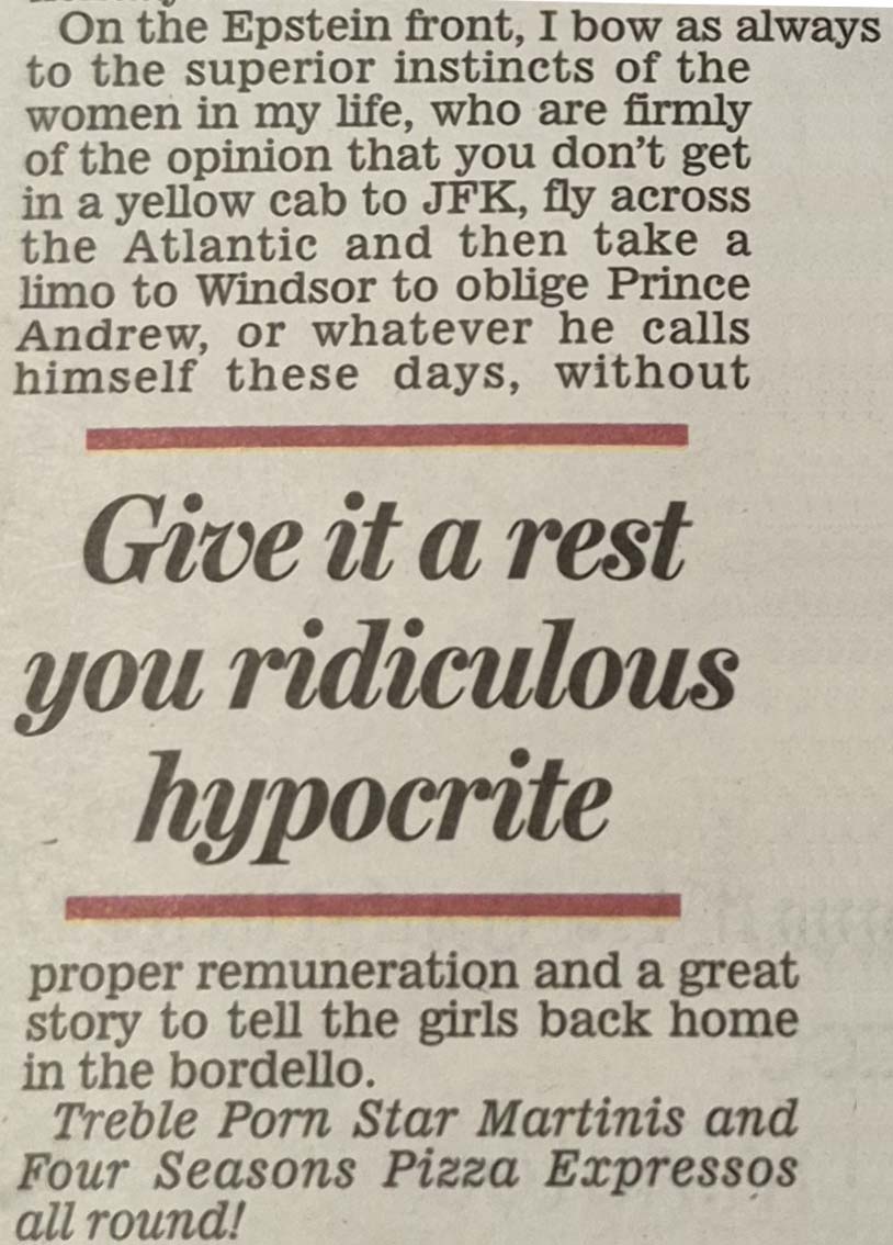 Richard Littlejohn, as will be seen from his 6 February 2026 Daily Mail column and previous pronouncements, thinks Epstein's 'victims' were not the incontrovertible victims they (and their supporters) make themselves out to be. Rather that they were aspiring call-girls all to willing to earn good money in the oldest profession. A working girl must begin sometime. The seeds of the idea of working as a prostitute do not all of a sudden germinate on the very next day after one's 18th birthday. Virginia Roberts/Giuffre was possibly not the wholly innocent 'victim' she (and now her family) make her out to be. Why not say 'No'? Why not go home? Ah! But the money is so good! The travel. Meeting a Prince! What about the parents? Turning a blind eye?