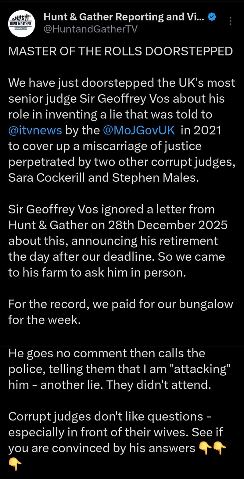 Sir Geoffrey Vos Master of the Rolls confronted by journalist in Spring 2026