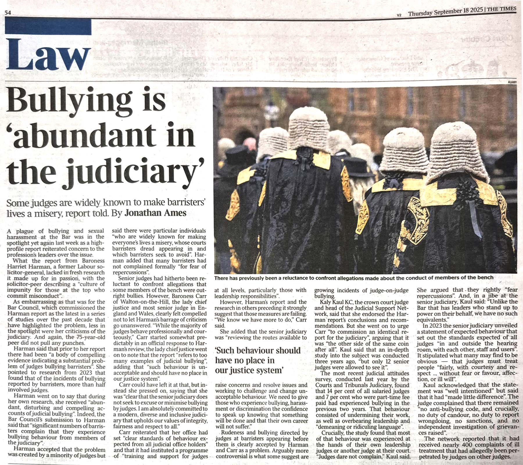 Baroness Harriet Harman has now published her September 2025 Report on Harassment at the Bar. She has also advised that members of the judiciary themselves bully barristers to a degree that is, effectively, completely unacceptable. Read The Times article below of 18 September 2025.