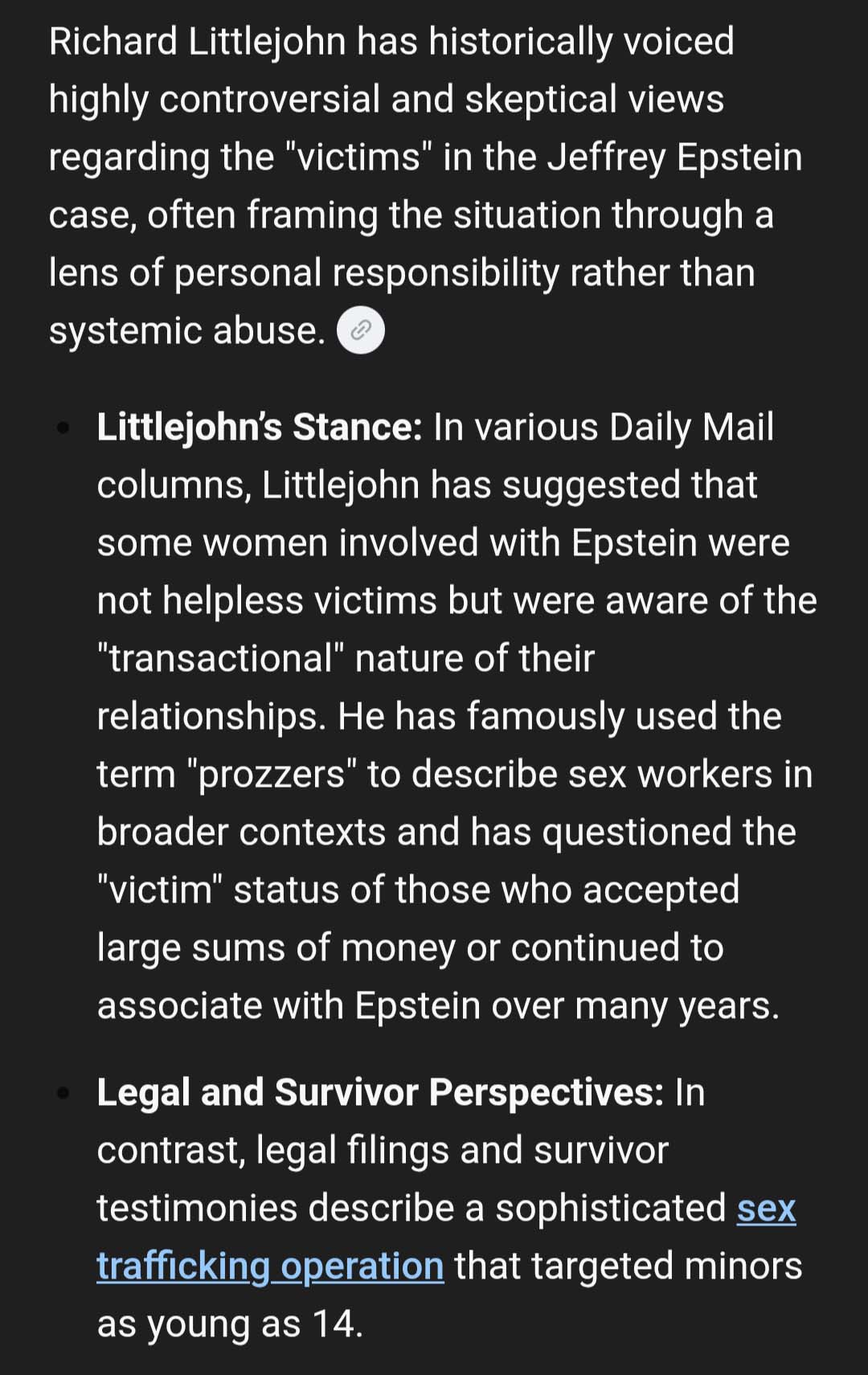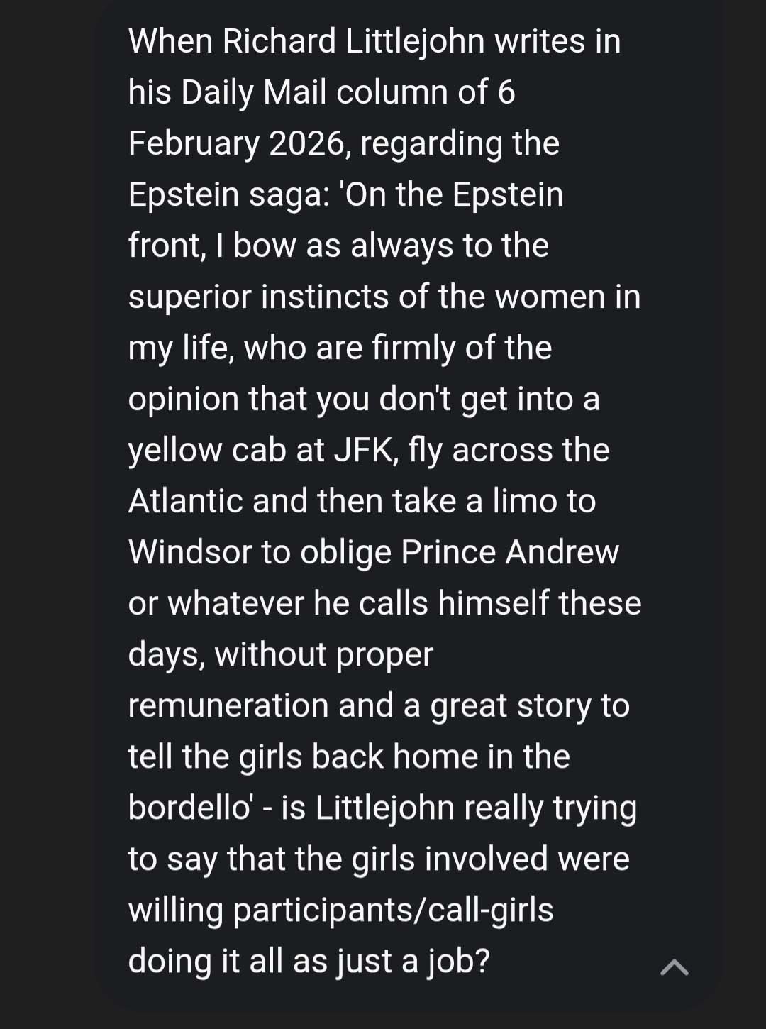 Richard Littlejohn, as will be seen from his 6 February 2026 Daily Mail column and previous pronouncements, thinks Epstein's 'victims' were not the incontrovertible victims they (and their supporters) make themselves out to be. Rather that they were aspiring call-girls all to willing to earn good money in the oldest profession. A working girl must begin sometime. The seeds of the idea of working as a prostitute do not all of a sudden germinate on the very next day after one's 18th birthday. Virginia Roberts/Giuffre was possibly not the wholly innocent 'victim' she (and now her family) make her out to be. Why not say 'No'? Why not go home? Ah! But the money is so good! The travel. Meeting a Prince! What about the parents? Turning a blind eye?